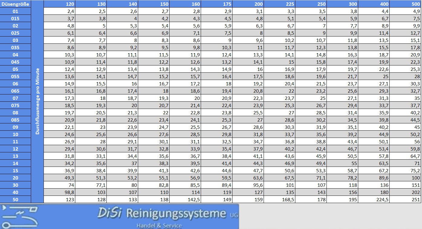 2. Wählen Sie in dieser Spalte die Durchflussmenge in Liter/Minute, so ergibt sich die ganz links angeführte Düsengröße.